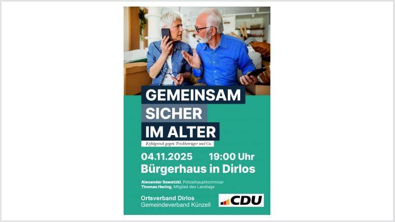 Der CDU-Ortsverband Dirlos/Keulos/Wissles und der CDU-Gemeindeverband Künzell laden Sie herzlich zu dem Vortrag „Gemeinsam sicher im Alter“ ein. In diesem Vortrag informiert Sie das Polizeipräsidium Osthessen über aktuelle Betrugsphänomene und Delikte zum Nachteil älterer Personen.