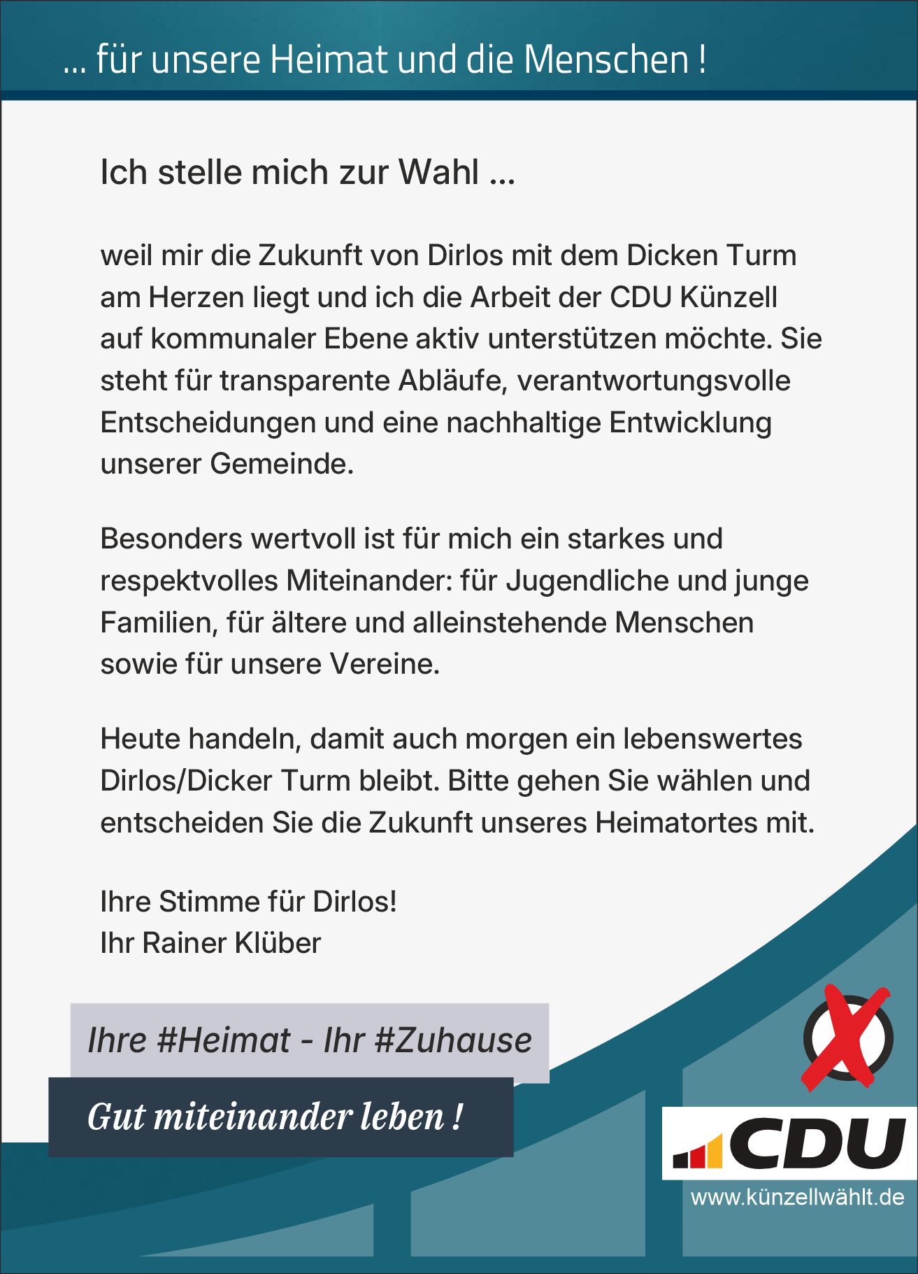 Ortsvorsteher Dirlos, Kandidat Ortsbeirat Dirlos / Dicker Turm | Platz 1 AdresseDIRLOS Empfehlen Sie uns!Bei Facebook teilen Bei Twitter (X) teilen Bei Whatsapp teilen Diese Seite drucken Diese Seite einem Freund schicken